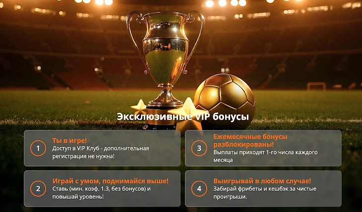 Достаточно делать ставки с коэффициентом от 1.30 на реальные деньги, чтобы повышать свой уровень в VIP-клубе. Самые активные игроки могут рассчитывать на фрибет до 100 000 тенге и кэшбэк до 50% каждый месяц.