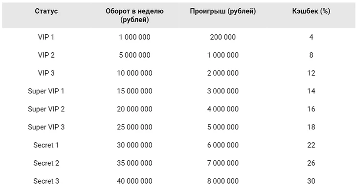 Статус участника зависит от еженедельного оборота ставок. Чем выше статус, тем больше процент кешбэка.
