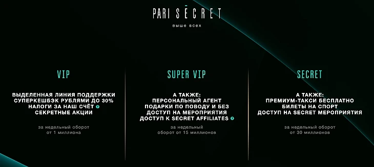 Букмекерская контора PARI запустила программу лояльности для премиальных игроков VIP-клуб PARI Secret, по которой клиенты получают кешбэк 30% от суммы проигранных ставок каждую неделю. Членство в клубе предусматривает возможность щедрых бонусов, доступы к secret мероприятиям и эксклюзивные акции для премиальных клиентов.