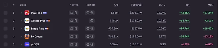 В топ-5 отчетливо выделяется PlayTime с действительно взрывной динамикой (четырехзначный YoY-рост и сильный месячный прирост), рядом – CasinoPlus и BingoPlus. При этом в первой пятерке есть и бренды, которые работают не по локальной лицензии.