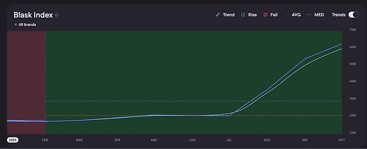 Рынок: по данным Blask, выглядит мощно и растет. 191 бренд, YoY +66.7%. Blask Index шел ровно до мая, а затем с лета взлетел почти вертикально вверх – к октябрю значения кратно выше весенних.
