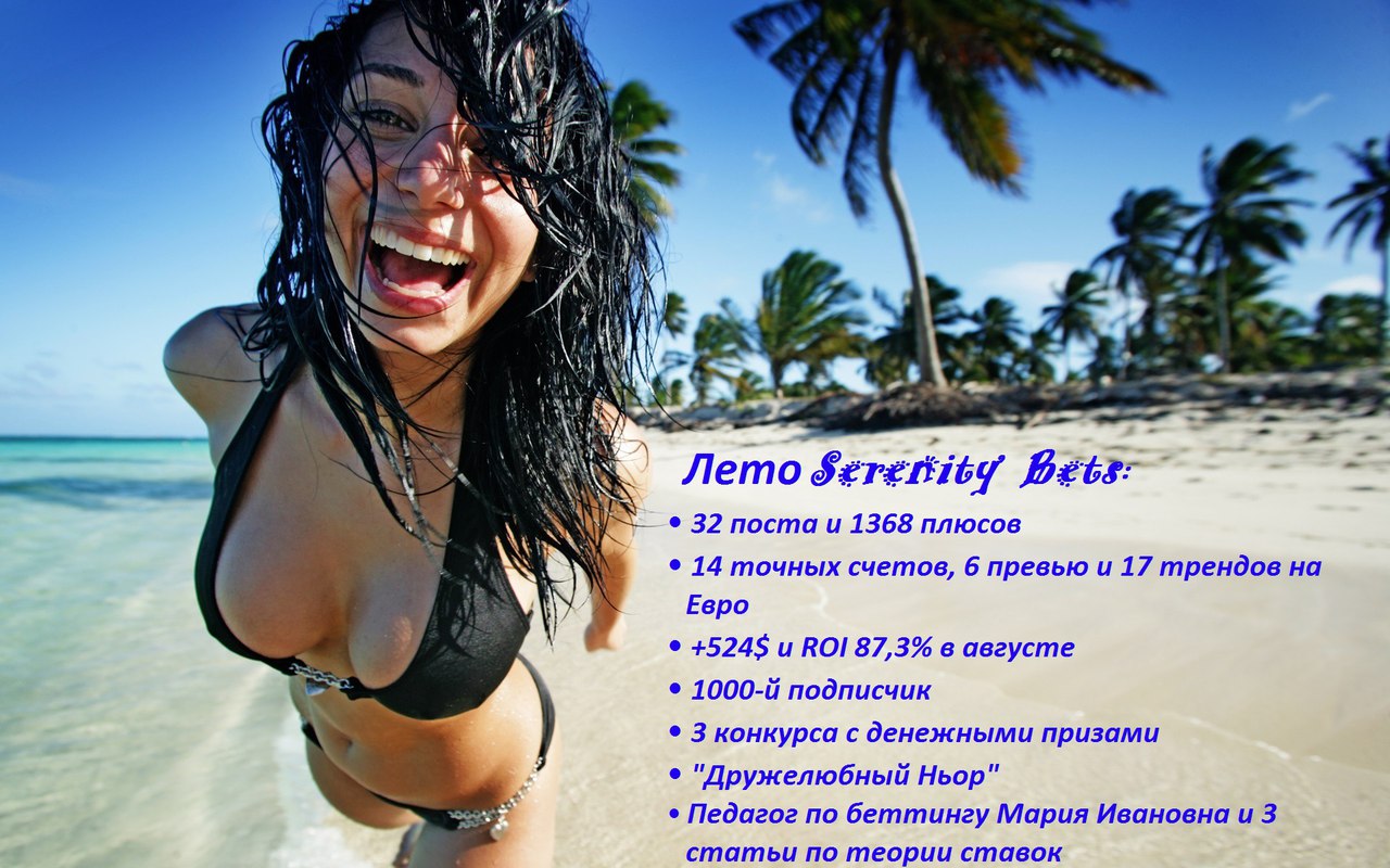 32 поста и 1368 плюсов; 14 точных счетов на Евро; +524$ прибыли с ROI 87,3% в августе; 1000-й подписчик и многое-многое другое. Подводим итоги бурного лета. Заходи, не стесняйся, у Serenity тебе всегда рады!