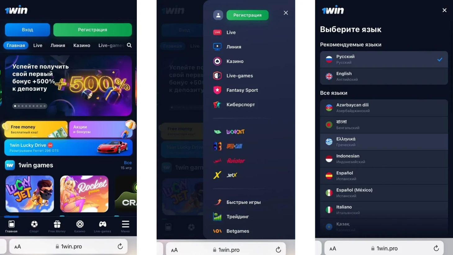 На официальном сайте 1win доступно более 20 языковых версий. По умолчанию открывается русская.