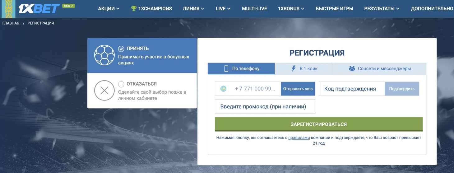 Для получения бонусов необходимо дать свое согласие на участие в бонусных акциях при регистрации аккаунта в 1xBet KZ.