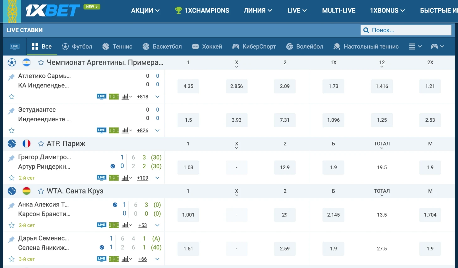 В целом можно сказать, что для букмекерской конторы 1xBet KZ характерны высокие коэффициенты и богатый выбор событий для ставок (свыше 1000 ежедневно). На сайте представлено более 30 видов спорта. Футбольный раздел включает матчи высших ведущих европейских футбольных лиг, международные клубные турниры и игры сборных, а также матчи чемпионатов многих стран (турниры из более чем 40 стран).