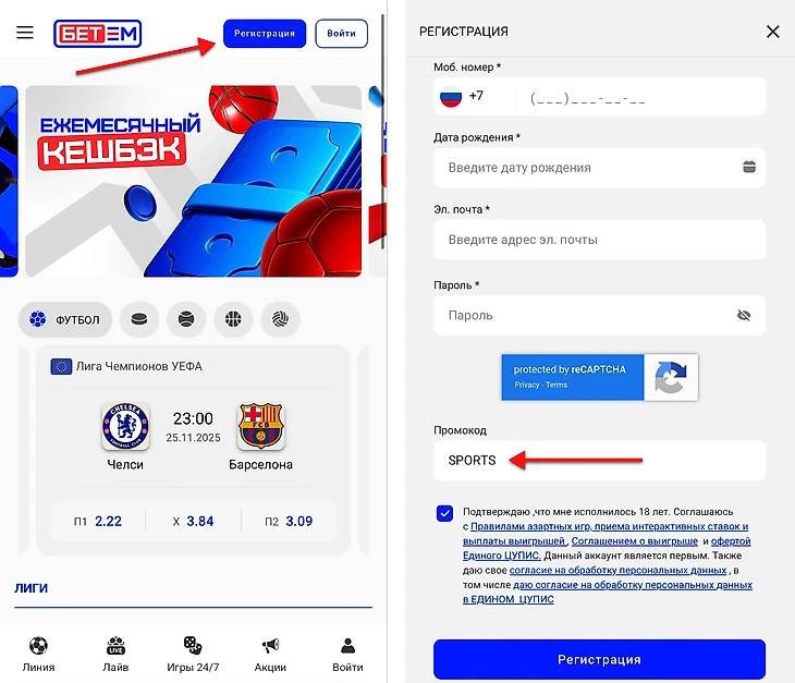 Пройти регистрацию в БК БЕТ-М можно только по номеру телефона. Возможность зарегистрироваться через соцсети отсутствует. Создать аккаунт можно на главном сайте, в мобильной версии и в приложении. Порядок действий одинаковый: