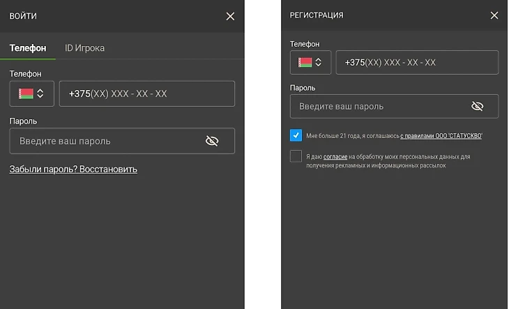 Если у вас ранее был аккаунт в белорусской версии Parimatch, заново регистрироваться не нужно и даже запрещено. Вы можете авторизоваться в Betera, используя те же данные. Для авторизации нажмите «Вход» справа вверху и введите данные, которые указывали, когда регистрировались в БК «Париматч».