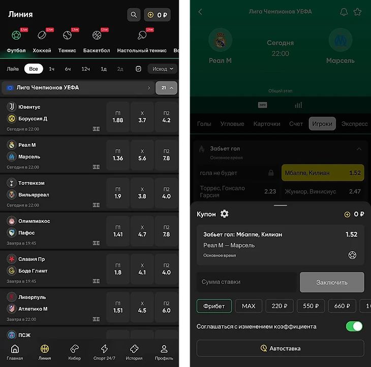 Аналитики букмекерской конторы уделяют большое внимание матчам с топовыми участниками. Например, на игры футбольной Лиги чемпионов (ЛЧ) букмекер дает порядка 1 500 вариантов ставок, в которые входят не только стандартные маркеты: помимо ставок на исход (победитель в матче), двойной шанс (кто не проиграет), форы (разница в счете) и тоталы (суммарный показатель очков, голов, шайб, геймов), можно заключить пари на то, будет ли в игре пенальти, смогут ли хозяева забить в обоих таймах, будут ли забиты голы в определенный промежуток времени и т.д.