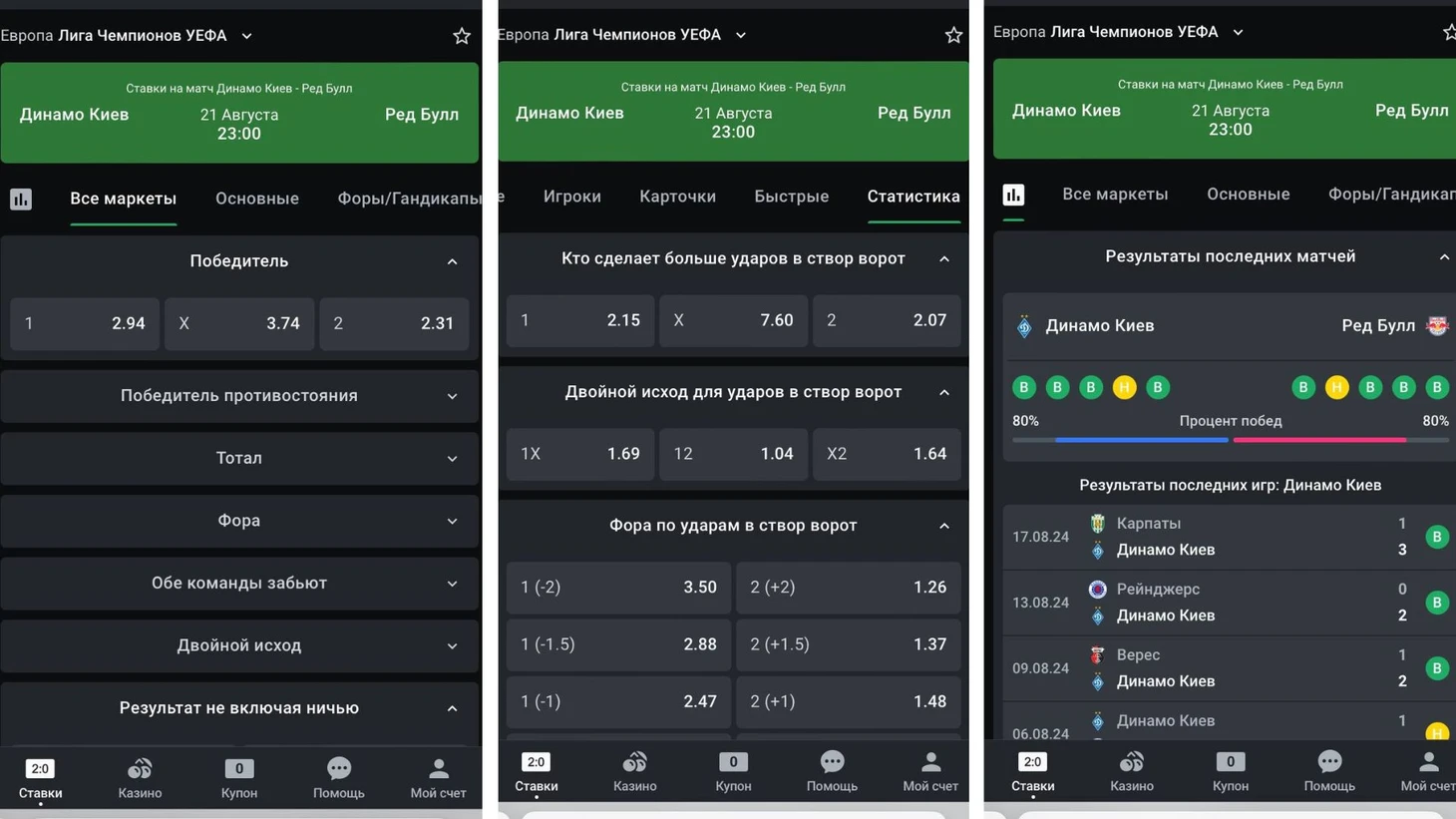 Для популярных спортивных дисциплин и турниров доступна обширная роспись. В менее популярных видах спорта и турнирах роспись ограничивается исходом, тоталами, формами и гандикапами.