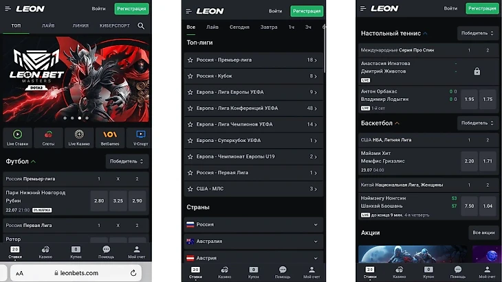Также букмекерская контора Леонбетс предлагает игрокам мобильное приложение на Андроид — пользователям доступны все те же функции, что на официальном сайте букмекерской конторы Leonbets.com. Кроме того, у букмекера есть мобильная версия сайта, интерфейс которой автоматически адаптируется под размер экрана устройства, с которого был выполнен вход на ресурс.