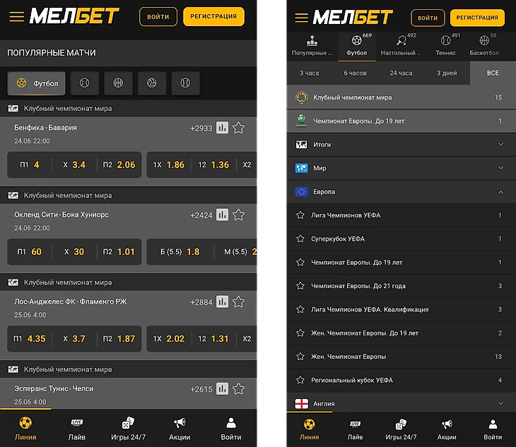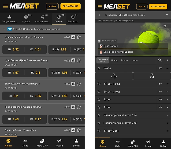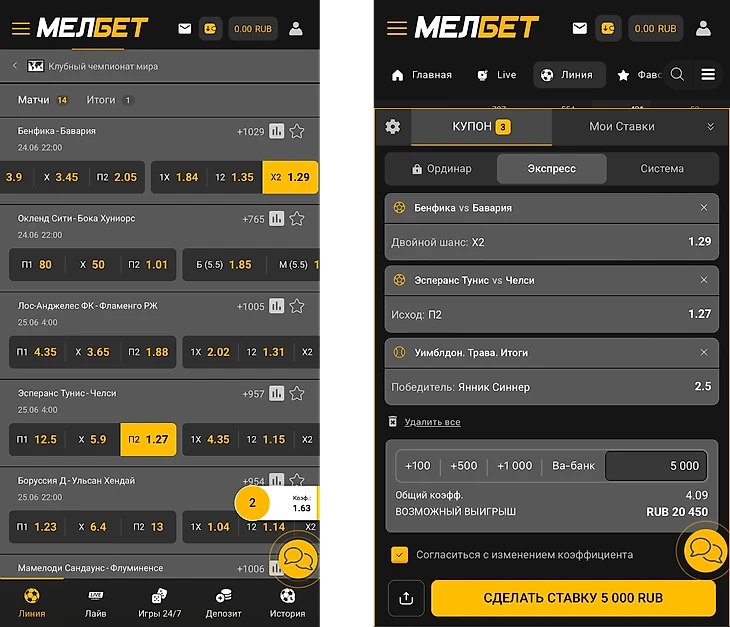 Сделать ставку в «Мелбет» можно на сайте, в мобильной версии и в мобильном приложении. Линия и коэффициенты везде одинаковая, но в мобильной версии и в приложениях отсутствуют прямые видеотрансляции. Чтобы сделать ставку-ординар с телефона: