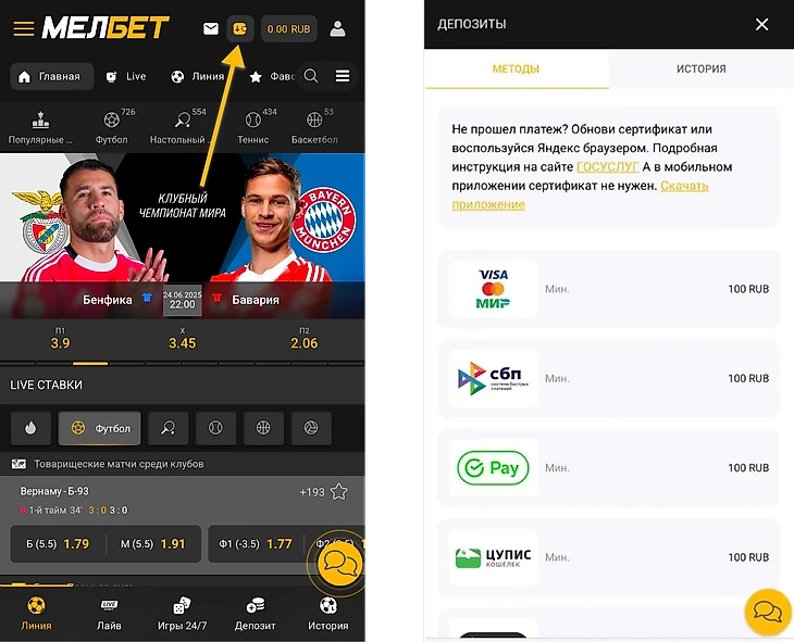 Внести депозит онлайн в букмекерской конторе «Мелбет» можно следующими способами: