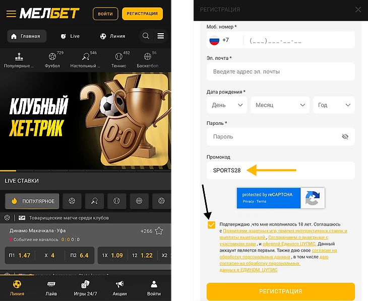 Пройти регистрацию в «Мелбет» можно на сайте, в мобильной версии или в мобильном приложении на iOS или Android. Процедура на всех платформах одинаковая. Быстрой регистрации в один клик или через соцсети не доступна.