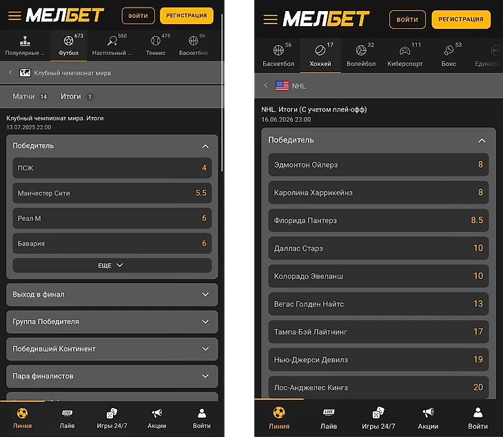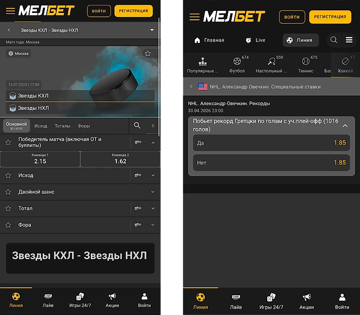 В хоккее наибольшая роспись предлагается на КХЛ и НХЛ – более 1000 рынков. В плей-офф этот показатель может превышать 1500 маркетов. «Мелбет» выставляет в линии широкий диапазон фор и тоталов на матч, и на отдельные периоды. Помимо этого, среди котировок доступны: