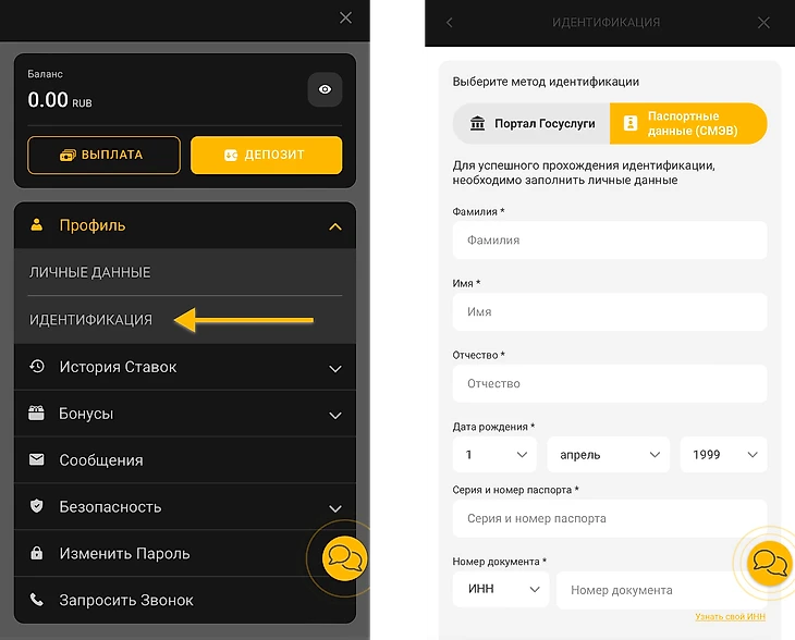 После регистрации новый клиент должен пройти идентификацию. Подтверждение личности необходимо, чтобы получить возможность пополнять свой игровой баланс, делать ставки на спорт и выводить выигрыш.