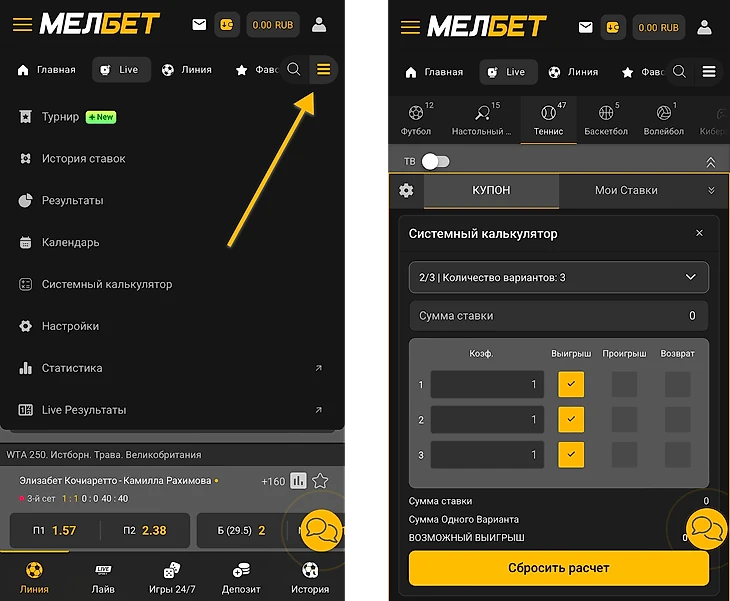«Мелбет» предлагает игрокам ряд вспомогательных инструментов, облегчающих ставочный процесс. Чтобы воспользоваться ими, нажмите на три полосы на верхней панели на странице мобильного сайта «LIVE» или «Линия». Пользователям доступен системный калькулятор, выбор формата коэффициентов, страницы со статистикой и результатами.