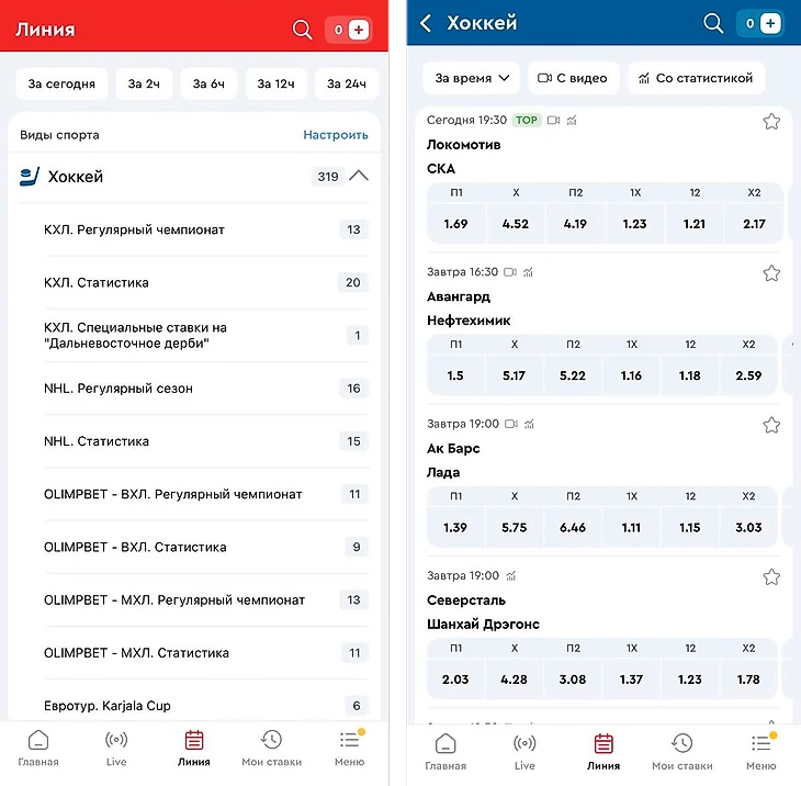 В хоккейном разделе широко представлены не самые популярные лиги и команды. Так, например, вы можете сделать ставку на рядовой матч команд из Австралии или Дании. В главных лигах стабильно открыта линия на долгосрочные события – выбрать фаворита в качестве победителя КХЛ или НХЛ можно задолго до старта нового сезона или уже по прошествии десятков матчей команд.