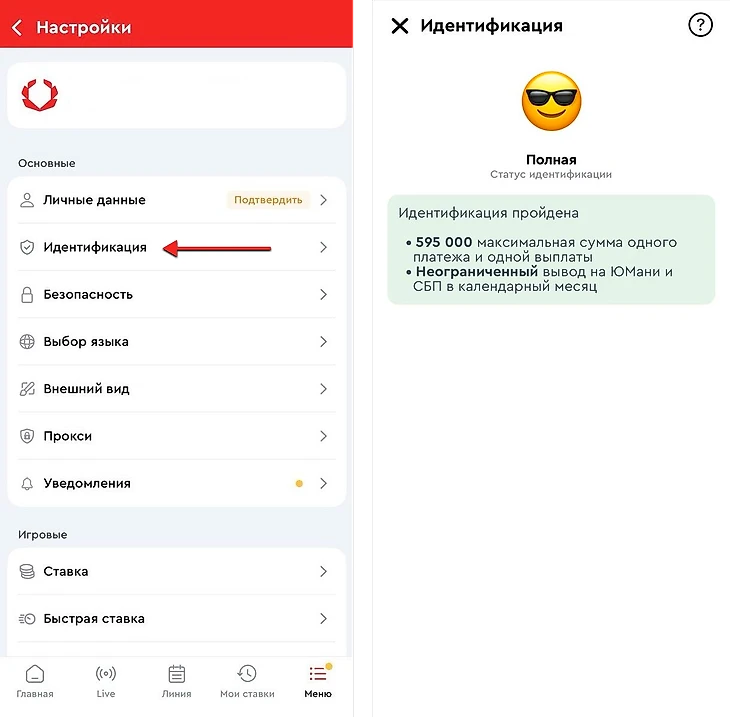 Следующий шаг — прохождение идентификации. Без подтверждения личности клиент не может совершать ставки на спорт в легальных БК РФ. Идентификация бывает упрощенной и полной. Статус идентификации влияет на лимиты по ставкам, а также суммы вывода и пополнения средств за одну операцию и в месяц.
