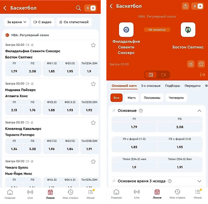 Говоря про крупные матчи, стоит отметить, что БК предоставляет роспись на серии (во время плей-офф стадии) и на статистику в конкретном матче (3-х очковые броски, подборы, передачи, фолы и тд.).