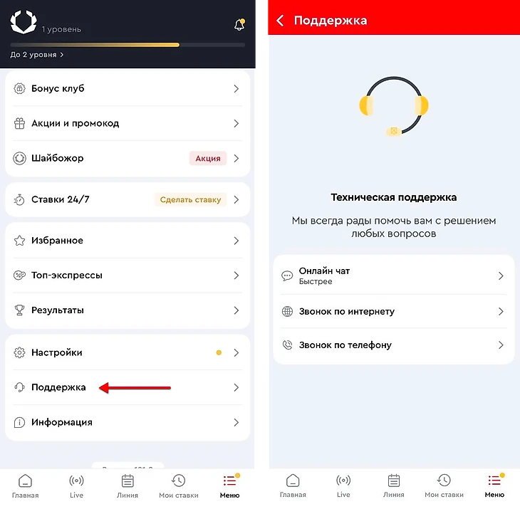 Чтобы открыть чат техподдержки со смартфона перейдите в меню, нажав на три точки в правом нижнем углу экрана, и выберите пункт «Служба поддержки». Среди доступных вариантов укажите «Онлайн чат». Обратите внимание, что это самый быстрый способ связи со операторами службы технической поддержки букмекера.