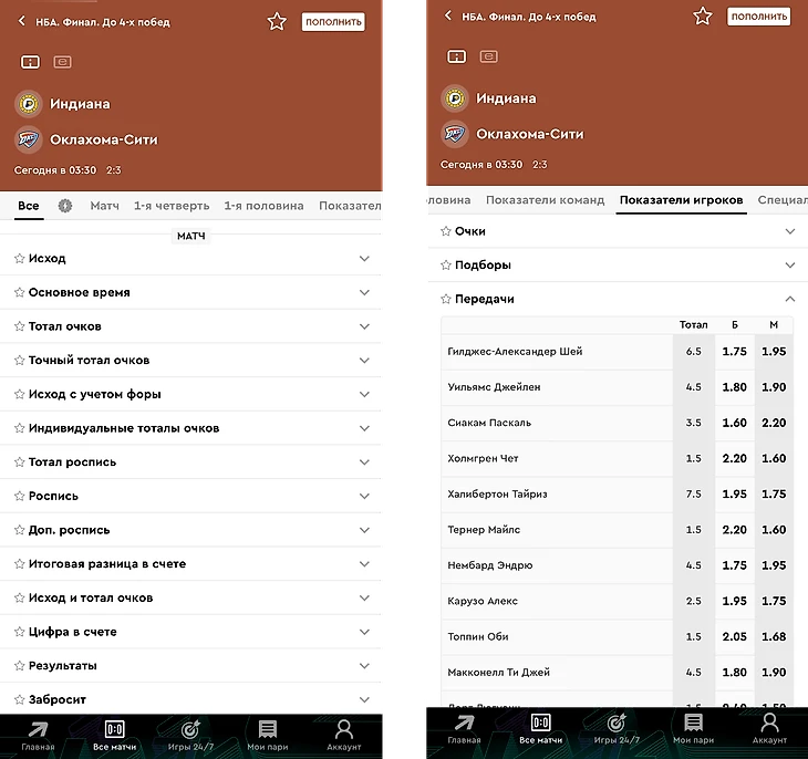 В наиболее популярных матчах, например, в НБА, PARI стабильно предлагает линию на индивидуальные действия игроков. Как правило, в котировках доступны все баскетболисты играющих команд. Среди видов ставок: индивидуальные татары на количество очков, подборы и передачи.