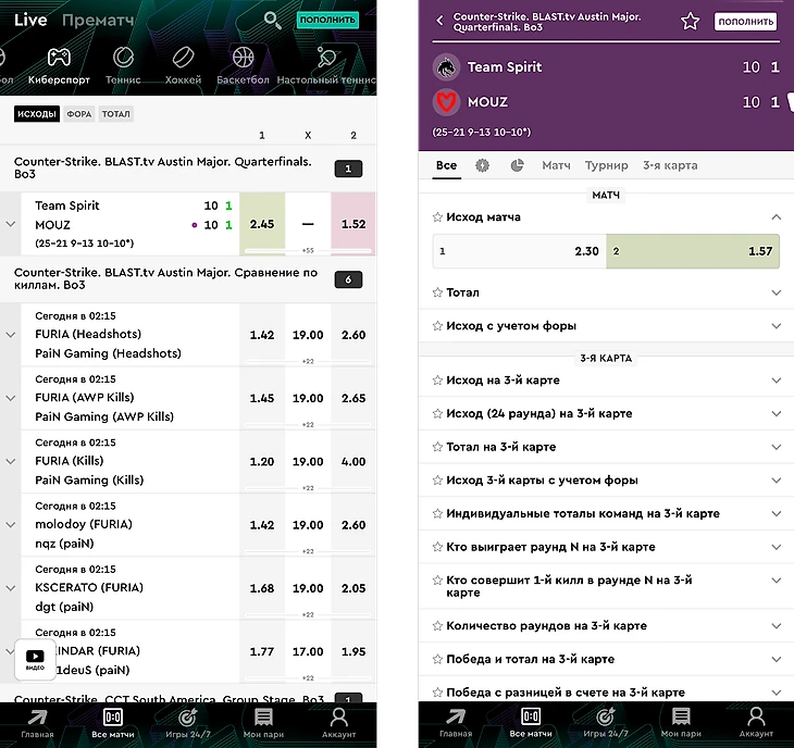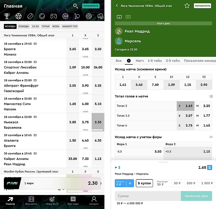 На топовые матчи в росписи (количество событий в матче) более 600-700 различных исходов. Большой выбор фор (показатели разницы в счете) и тоталов (суммарное число голов, очков, шайб, других игровых показателей).