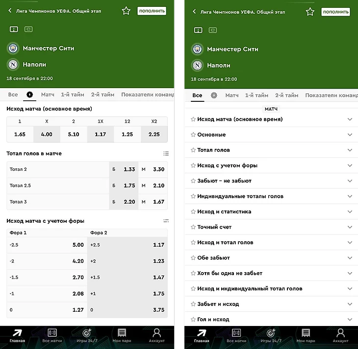 Представлены ставки тайм/матч, комбинированные пари: победа и обе забьют, победа и тотал, двойной шанс и общий тотал. Можно поставить на время первого гола, результат каждой команды, голевые действия игроков, статистику угловых и желтых карточек. На странице матча доступны даже долгосрочные ставки.
