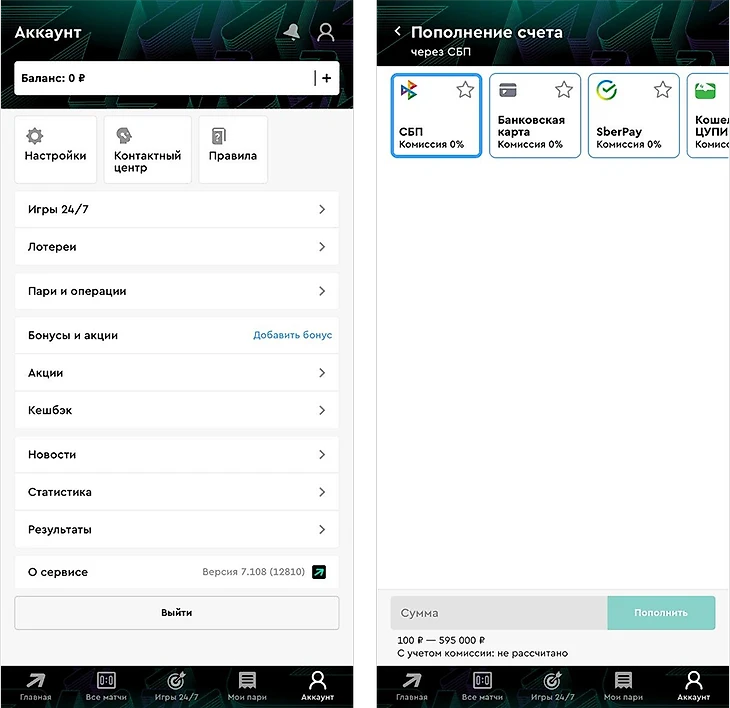 Нажать «Пополнить» на главной странице или «Аккаунт» — «Пополнить баланс»;