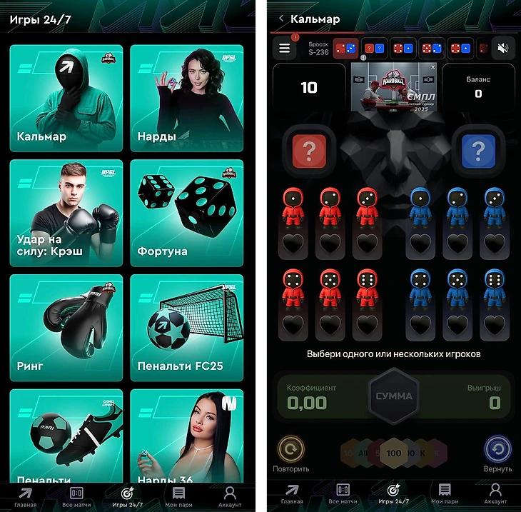 Среди доступных вариантов есть более традиционные виды спорта – дартс, нарды, бокс. Есть и любопытные новинки, одна из таких – стилизованная под сериал игра «Кальмар».