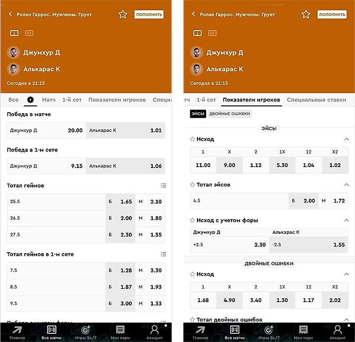 Маржа 4,5 - 5,5% на матчи турниров серии «Большого шлема», Masters, ATP 500 и WTA 500. На менее рейтинговые турниры маржа составляет 8 - 9%.