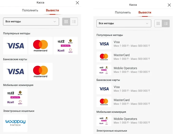 Минимальная сумма депозита зависит от выбранного способа. Чаще всего игроки пополняют счет банковскими картами – в этом случае можно внести от 200 до 5 000 000 тенге.
