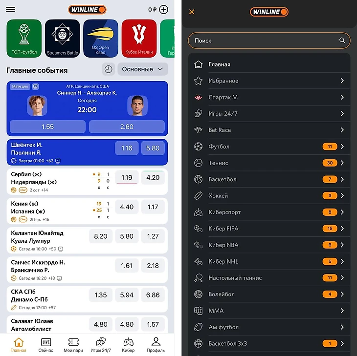 Теннисная линия и роспись в Винлайн — не самая сильная сторона букмекера Winline. В линии представлены турниры уровня ATP, WTA, ITF, Challenger. Линия в одинаковом виде представлены на турниры всех категорий. На турнирах, начиная с ATP / WTA 250 и до Турниров Большого Шлема (ТБШ), предоставлена возможность делать долгосрочные ставки на победителя турнира.