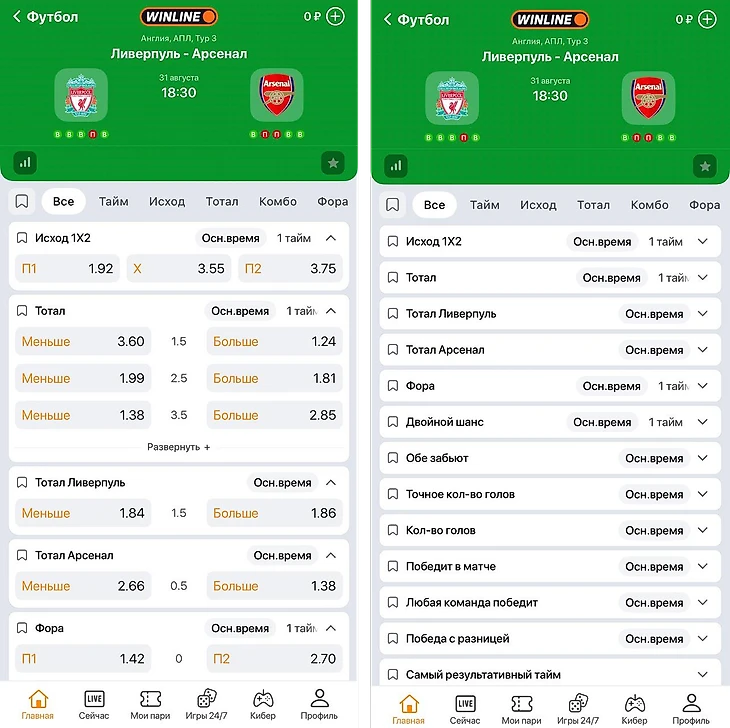 Открыть необходимый матч в «Линии» или «Live сейчас»;