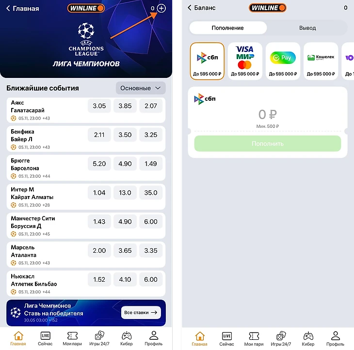 Минимальная сумма пополнения счета в БК WINLINE составляет 500 рублей. Максимальный размер — 595 000 рублей. У букмекера представлен широкий список для возможности пополнить баланс: банковские карты, СБП, СберPay, Кошелек ЦУПИС, ЮMoney, баланс мобильного телефона.