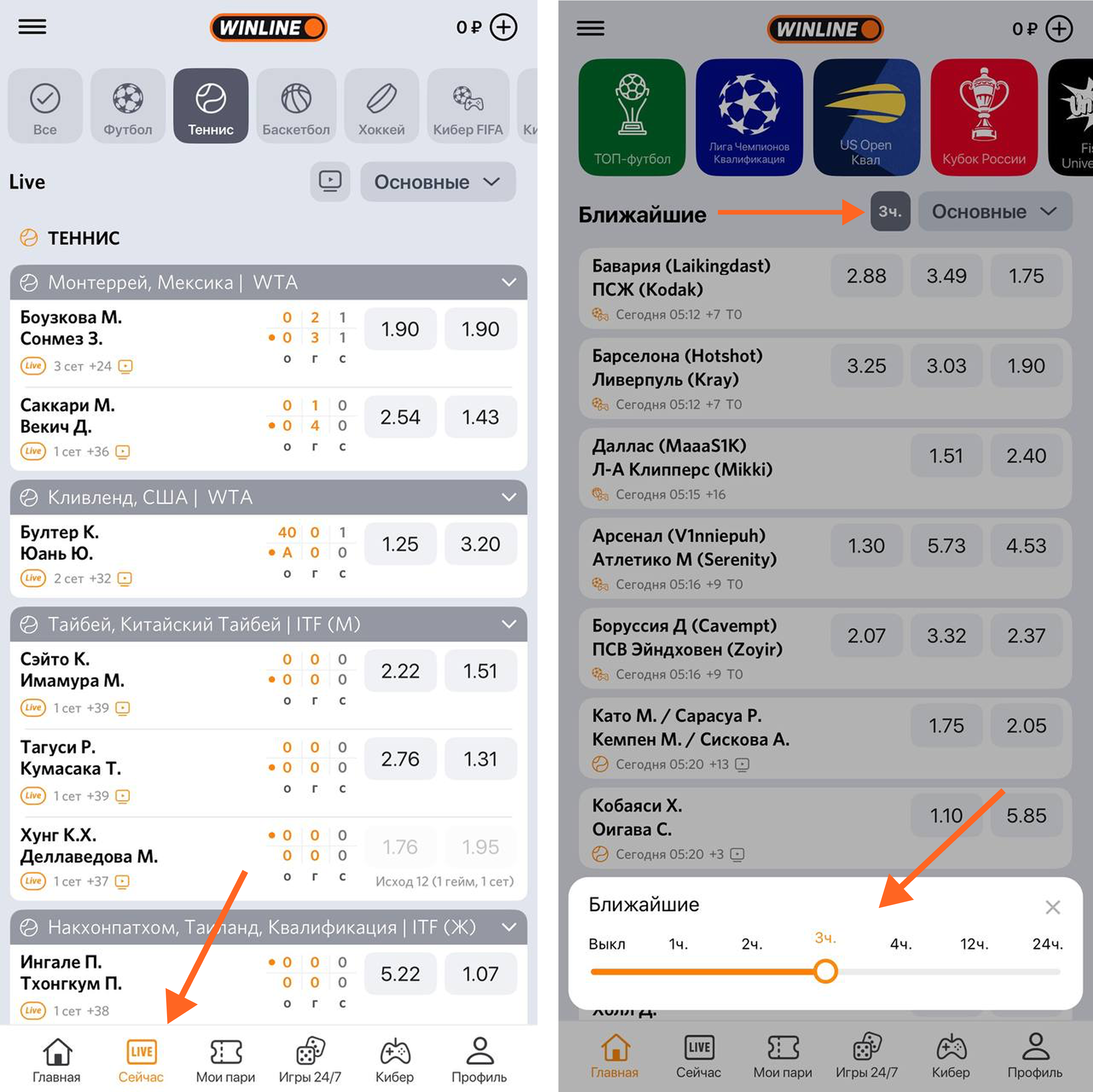 В левом меню выберите режим спортивных событий «Live Сейчас» или «Ближайшие»;