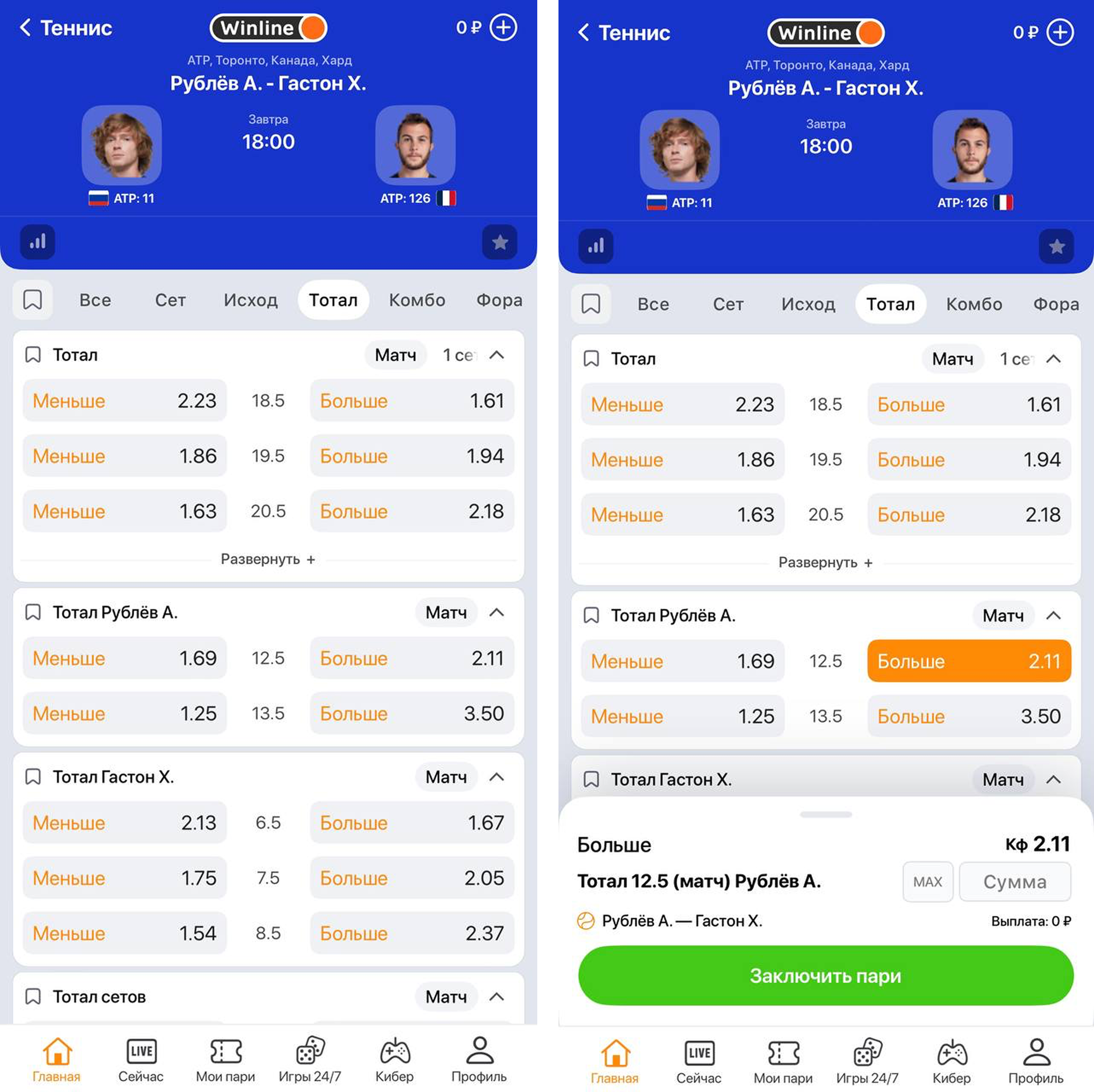 Ставить на индивидуальный тотал можно не только на теннисные матчи, но и на сеты. Для примера рассмотрим матч между Андреем Рублевым и Уго Гастоном. Шансы первого теннисиста оцениваются выше, соответственно, на него предлагается более высокий индивидуальный тотал – 12,5. Наша ставка – ИТБ1 (12,5) за 2.11. Чтобы пари сыграло, Рублев по итогам всего матча должна набрать не менее 13 геймов.