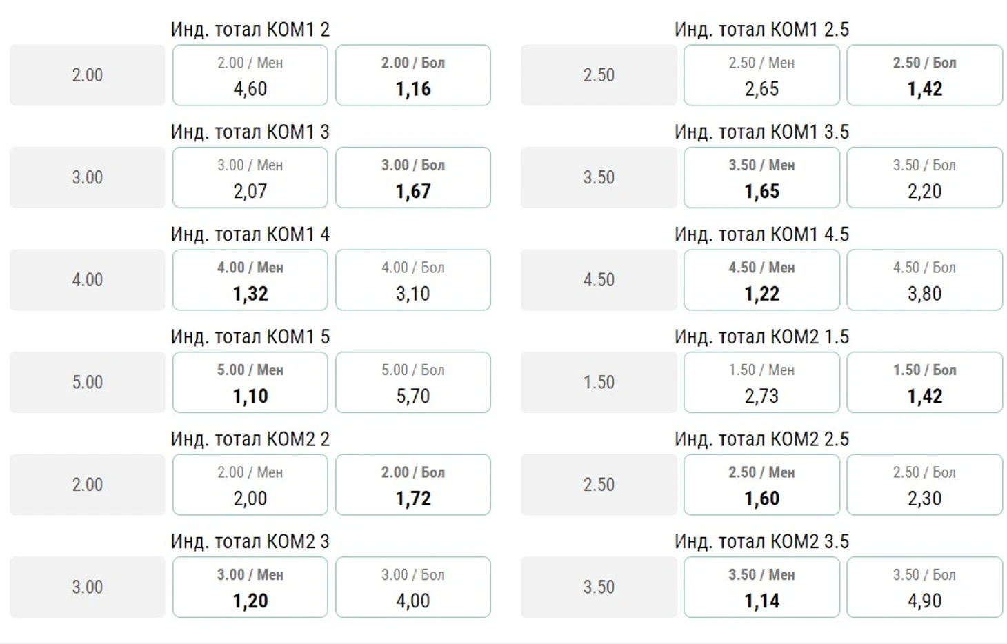 ИТБ1 (1,5) – индивидуальный тотал 1-й команды больше 1,5;