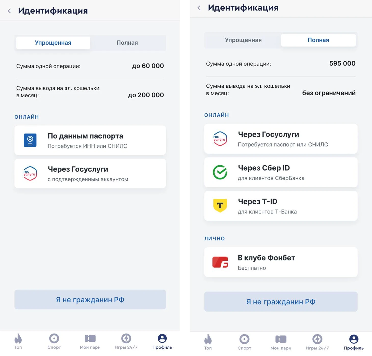 «В букмекерской компании «Фонбет» есть два уровня идентификации: начальный и основной. Они отличаются лимитами и процедурами прохождения. Уровень идентификации можно повысить в любой момент.