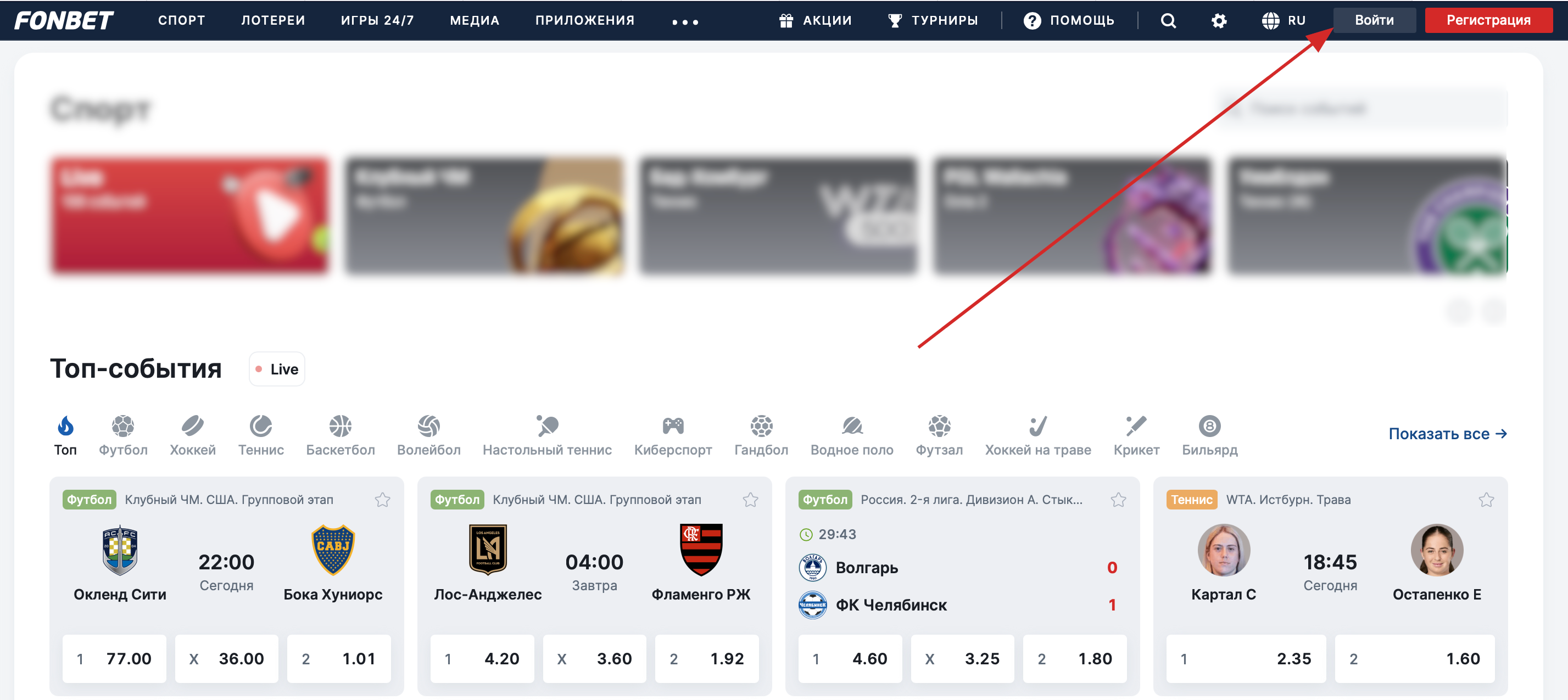 Чтобы выполнить вход в аккаунт на сайте «Фонбет», вам нужно на кнопку «Вход». В веб-версии кнопка находится в правом верхнем углу: