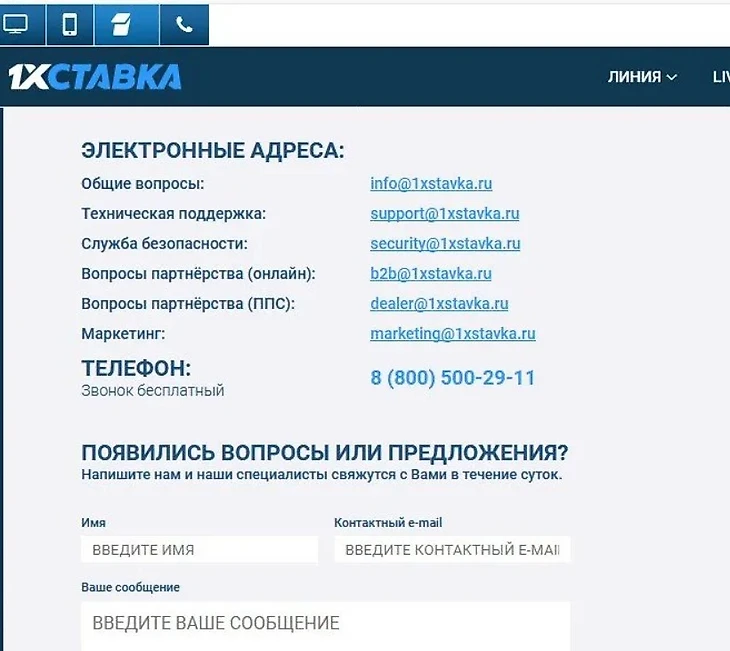 Сразу ответим на главный вопрос – удалить аккаунт в букмекерской конторе 1xstavka без возможности восстановления нельзя. Правила и функционал БК не предполагают такой функции. Теоретически можно обратиться в службу поддержки компании по контактам, указанным на скриншоте ниже, и попросить их полностью стереть вашу личность из базы данных. Но 99% вероятности, что саппорт ответит вам то же самое – удаление аккаунта не предусмотрено.