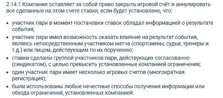заключение пари на договорные матчи. Сюда относятся клиенты, которые на момент заключения пари имели информацию о конечном результате или возможность оказать на него влияние, а также клиенты, которые использовали любые нечестные способы получения информации или обхода ограничений БК (пункт правил 2.14.1);