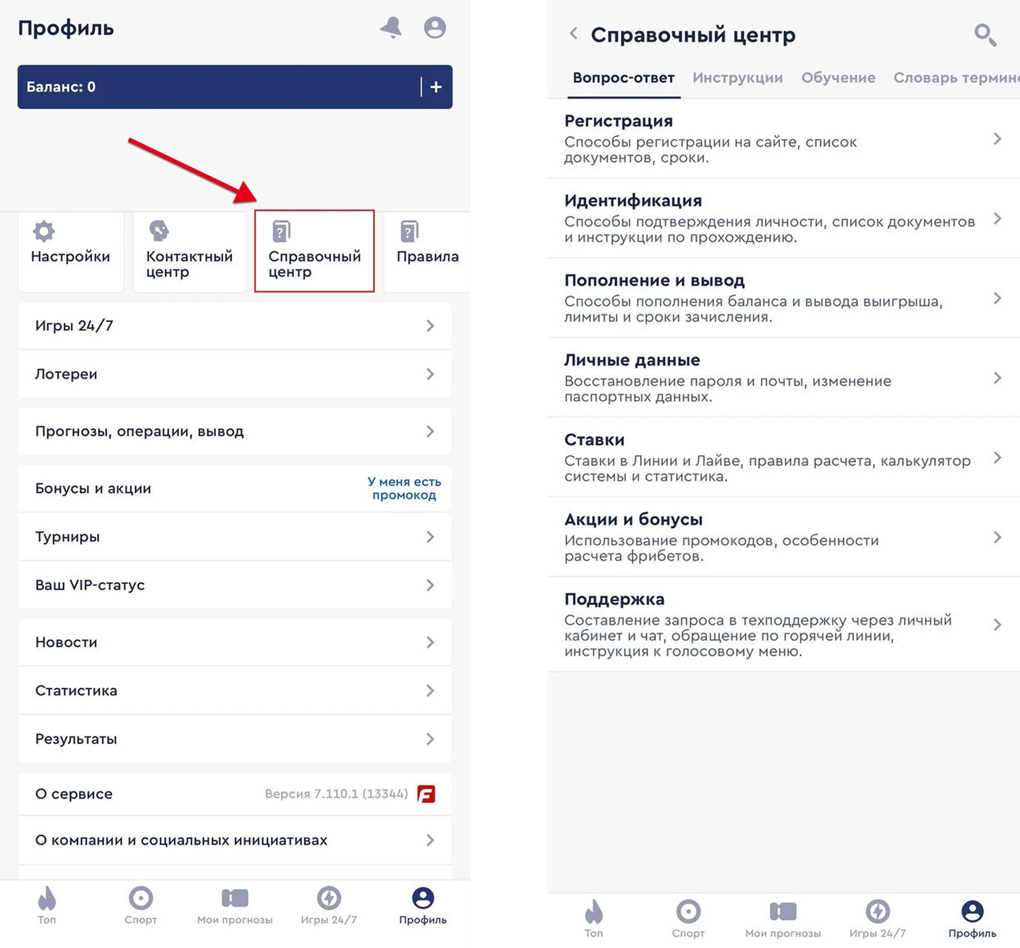 вопрос-ответ: регистрация, идентификация, пополнение и вывод, личные данные, ставки, акции и бонусы, технические вопросы;