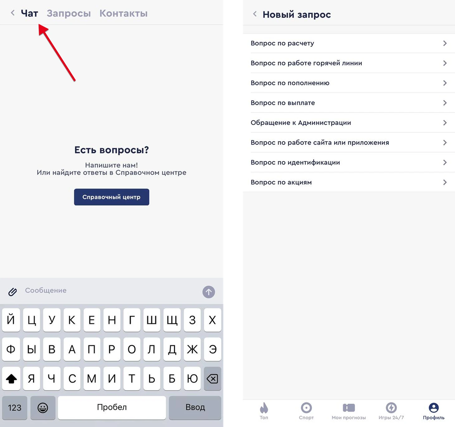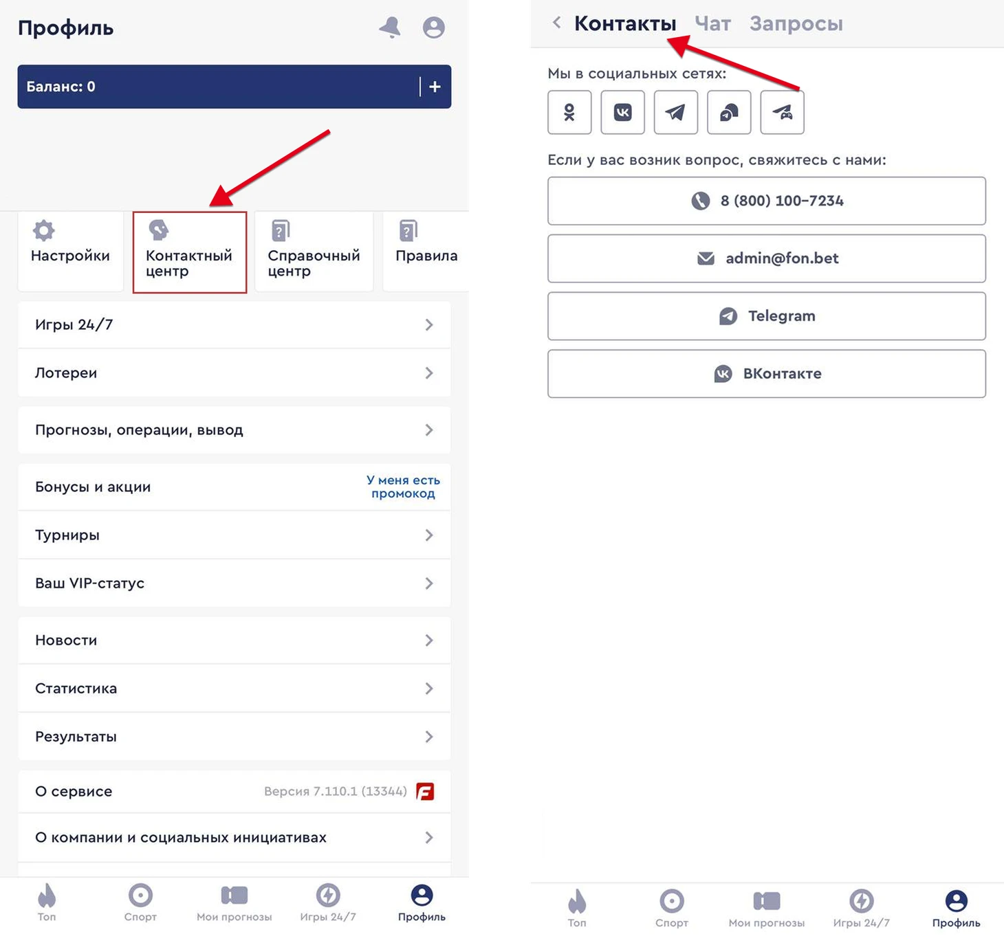 В приложении букмекерской конторы все способы связи со службой поддержки представлены в «Контактном центре». Он находится в меню.