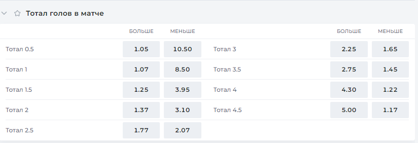 • В футболе ставки на тотал (общее количество голов) чрезвычайно популярны. Они позволяют игрокам делать прогнозы на количество голов в матче, что особенно интересно при матчах с высокими коэффициентами. Кэфы от четырех и больше — обыденная история.