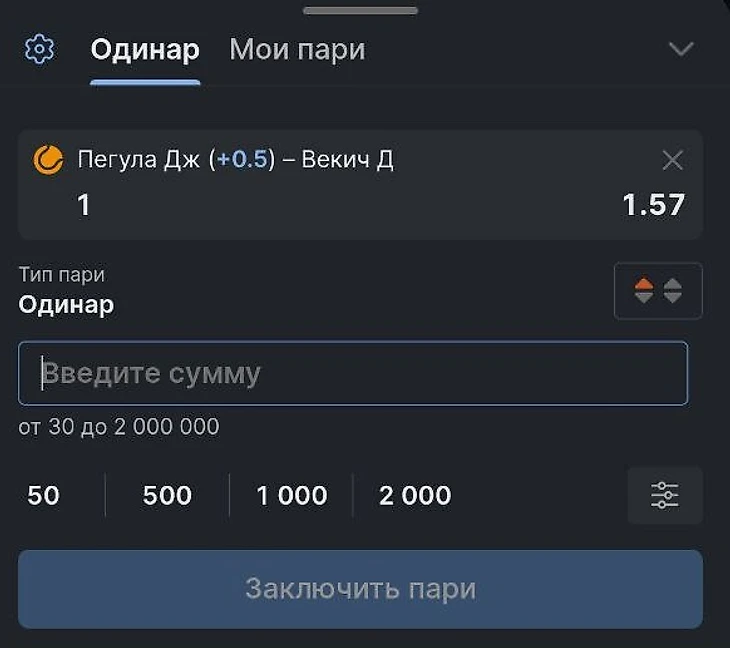 Пример №2. Матч Пегула — Векич на турнире в Берлине. Выбор беттора — Ф1 (+0,5) с коэффициентом 1.57. Ставка сыграет, если американка не проиграет хорватке по количеству набранных геймов. При этом победа Пегулы в матче — не гарантия совпадения пари: например, счет 1:6, 6:4, 6:4 в пользу Джессики не принесет выигрыша беттору.