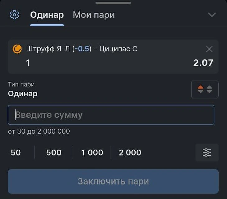 Пример №1. Матч Штруфф — Циципас на турнире в Галле. Беттор выбрал ставку Ф1 (-0,5) по геймам с коэффициентом 2.07, она сыграет, если Штруфф наберет больше геймов, чем Циципас. При этом немецкому теннисисту не обязательно побеждать в матче – например, ставка пройдет при счете 6:3, 6:7, 6:7 в пользу грека (счет по геймам будет 18:17).