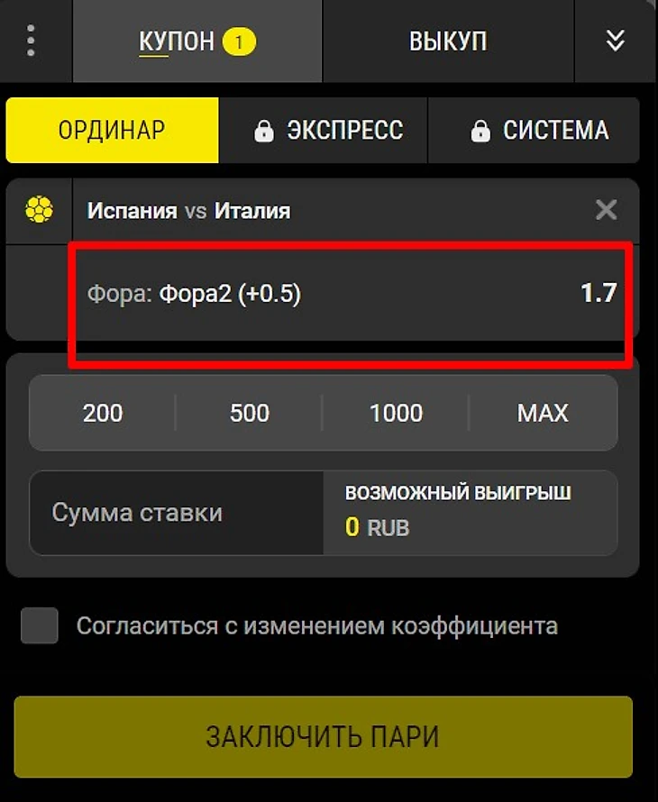 Пример №2. В матче ЧЕ между Испанией и Италией игрок ставит на фору 2 (+0,5) за кэф 1.70. Ставка сыграет, если итальянцы победят или сыграют вничью.