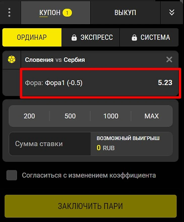 Пример №1. В схватке Евро-2024 Словения — Сербия беттор выбрал ставку на фору 1 (-0,5) с коэффициентом 5.23. Пари сыграет, если словенцы одержат победу с любым счетом.