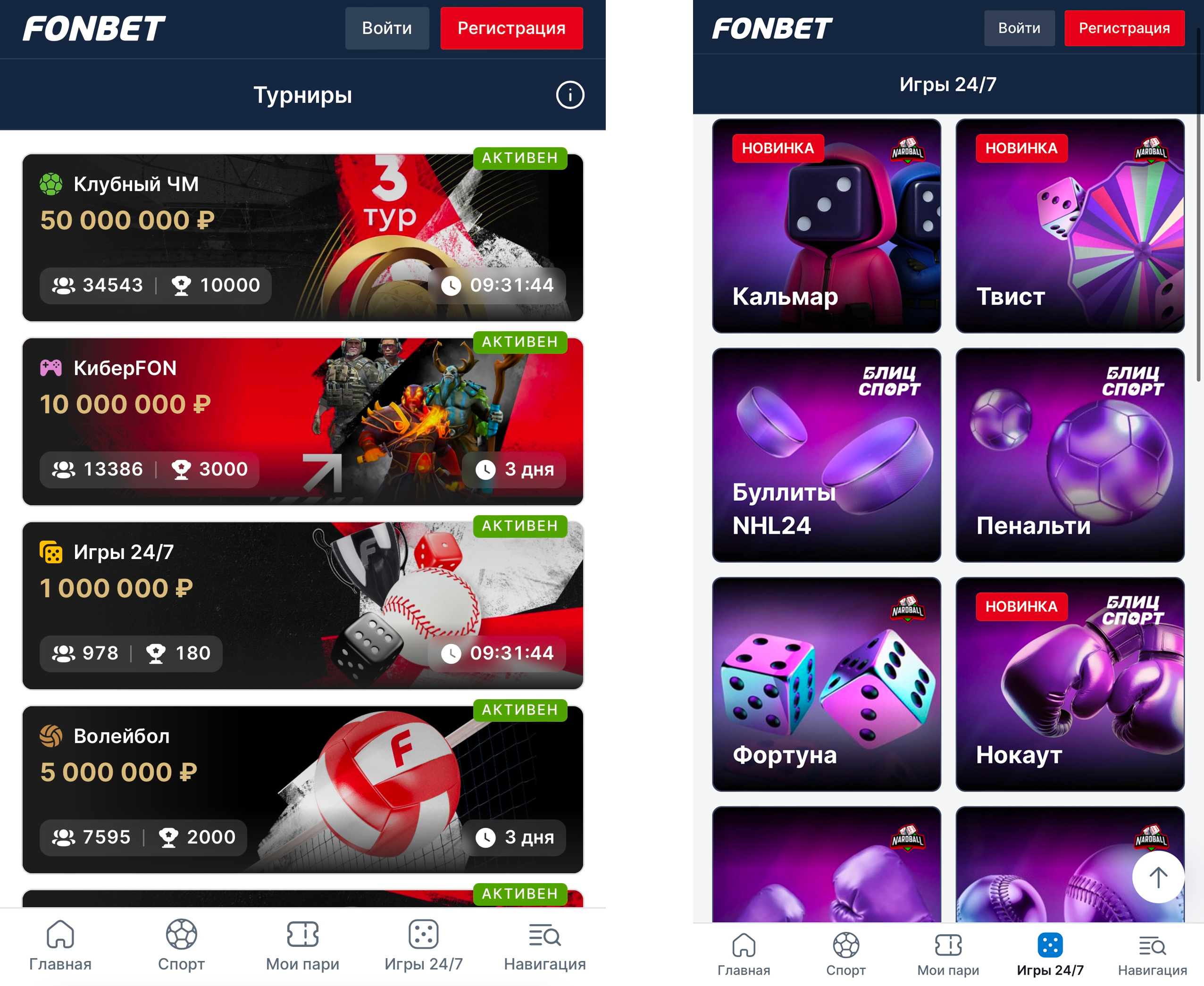 «Игры 24/7» — формат быстрых ставок, среди доступных игр есть пенальти, дартс, нарды, твист и более десятка других.