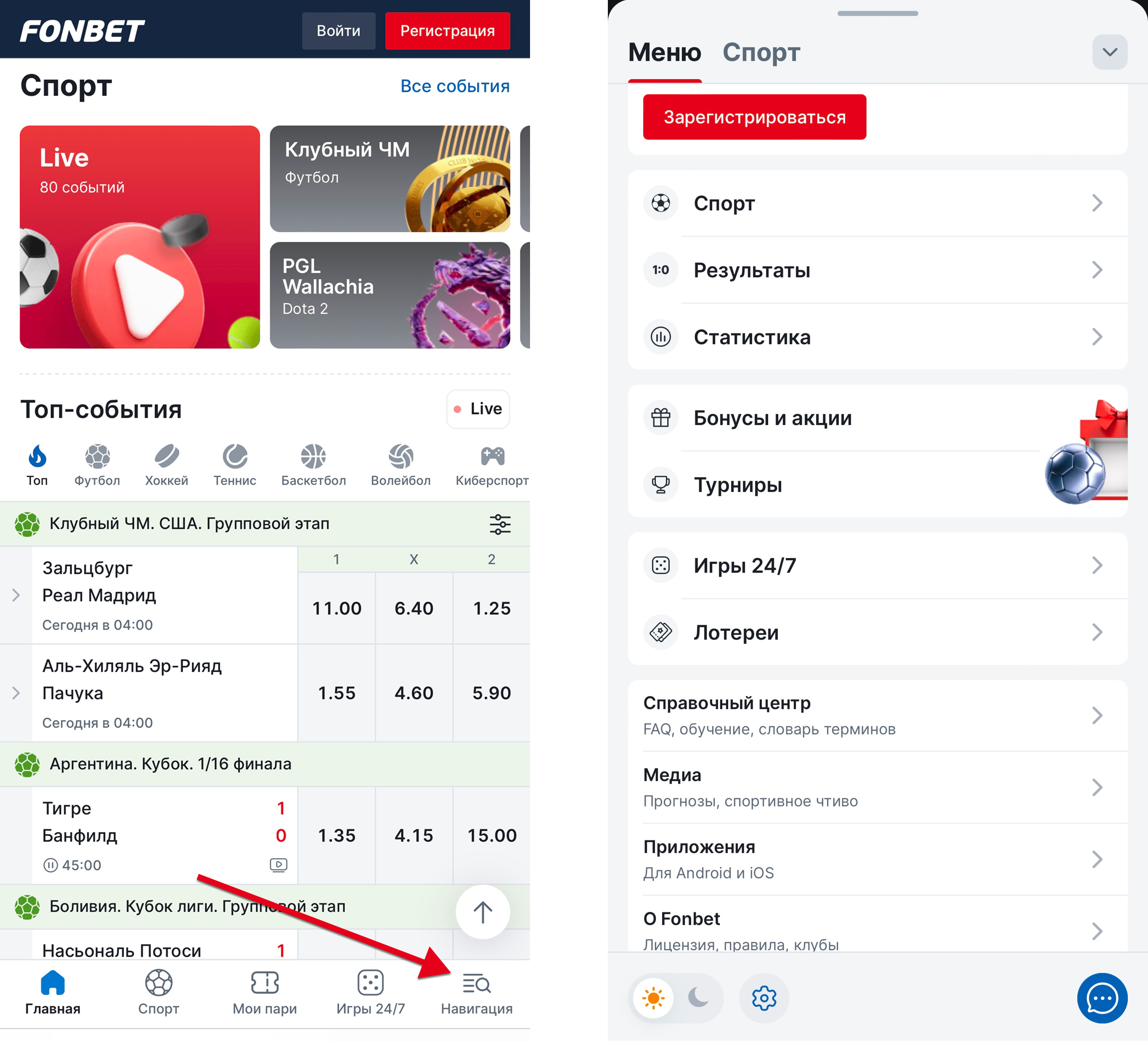 Интерфейс мобильной версии БК «Фонбет» автоматически адаптируется под размер экрана смартфона или планшета. В правой верхней части экрана расположены кнопки «Вход» и «Регистрация», в правой части снизу можно найти иконку в виде трех параллельных полосок с названием «Навигация» – в него вложены следующие разделы сайта:
